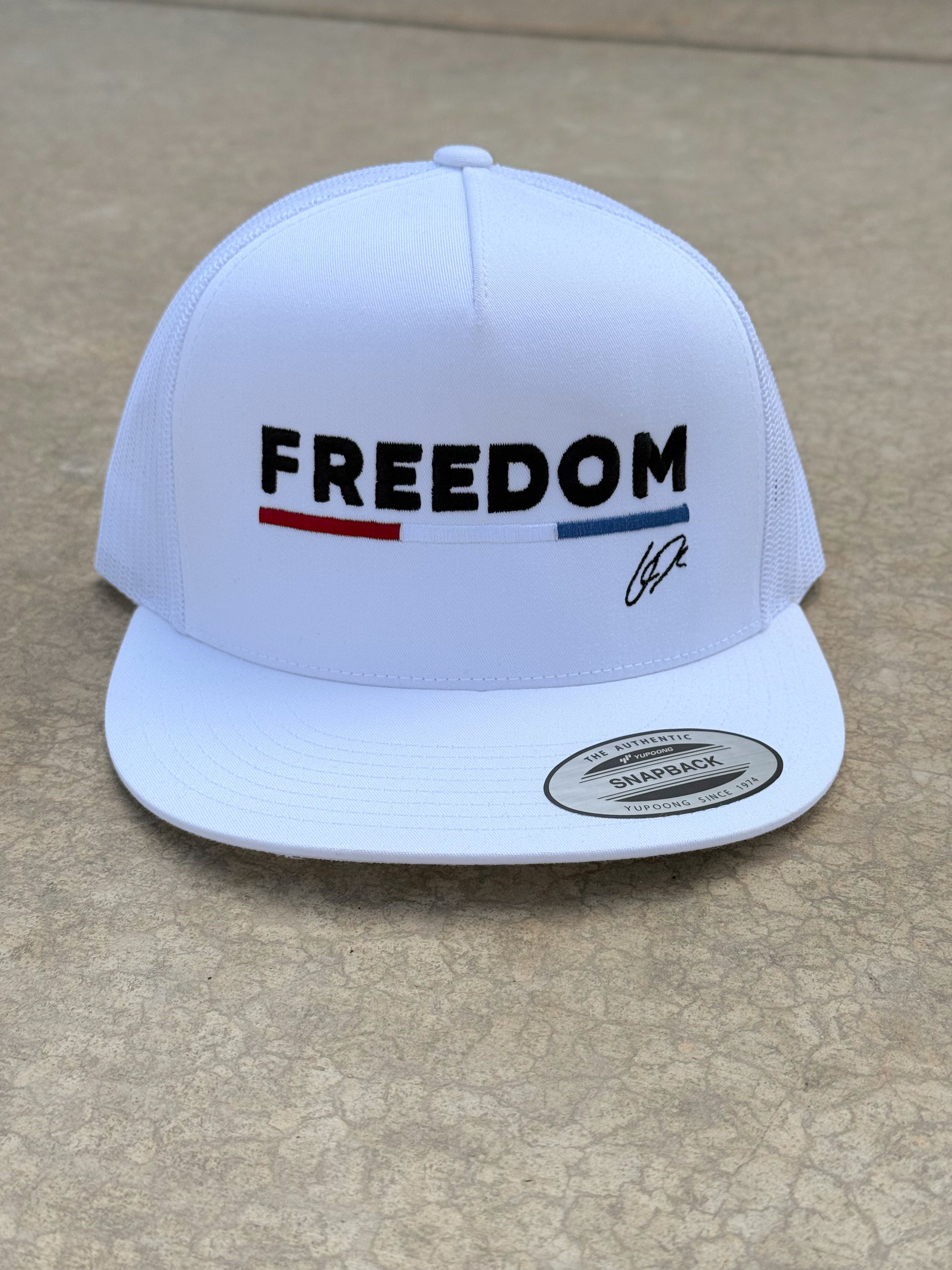FREEDOM, American Flag Bar, and CK Initials embroidered on a Yupoong 6006 Classic Trucker SnapBack Hat in white.